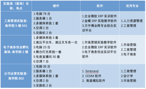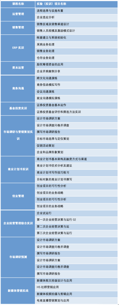 ERP实训、跨专业综合实训、企业项目调研实战、销售管理、资本运营、商务沟通、市场调研与营销策划实训、商业计划书实训、创业管理