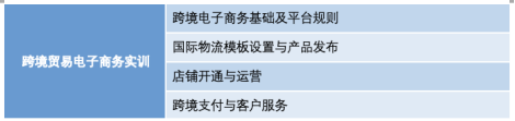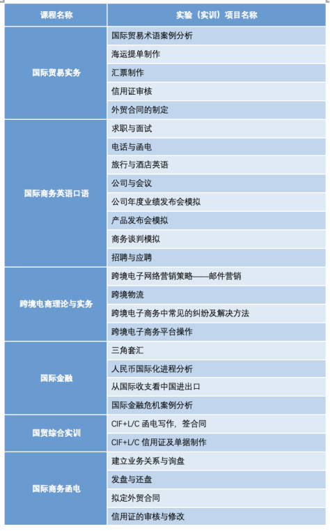 国际贸易实务、国际商务英语口语、跨境电商理论与实务、国际金融、国际商务函电、跟单实务、跨境电商专业英语、国际商法与惯例、市场调研与预测、国际市场营销、国贸单证实训、国际结算银行实操、报关报检综合实训、跨境贸易电子商务实训、国贸综合实训、企业管理综合实训