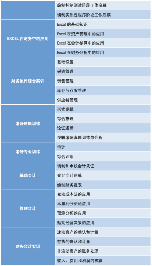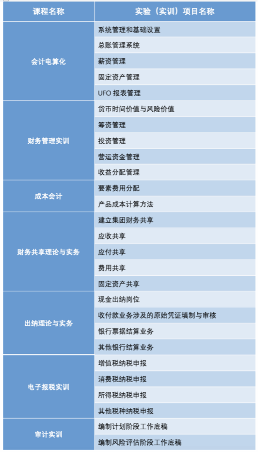 会计电算化、财务管理实训、成本会计、财务共享理论与实务、出纳理论与实务、电子报税实训、审计实训、EXCEL在财务中的应用、财务软件综合实训、考研逻辑训练、考研专业训练、基础会计、管理会计、财务会计实训