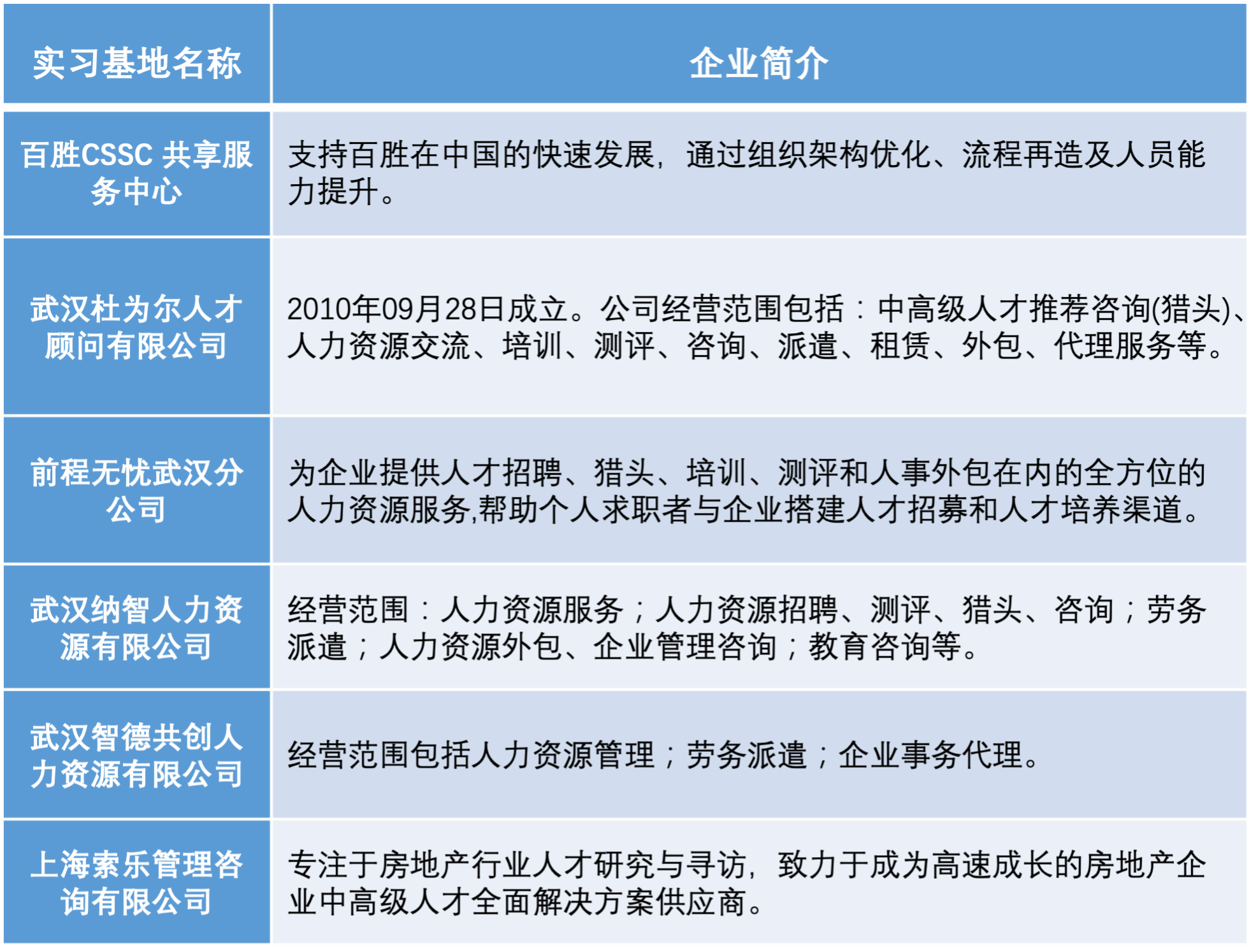 人力资源管理专业拥有百胜CSSC 共享服务中心、前程无忧武汉分公司、武汉杜为尔人才顾问有限公司等等实习实训基地,可接收人力资源管理、市场营销、工商管理专业学生。