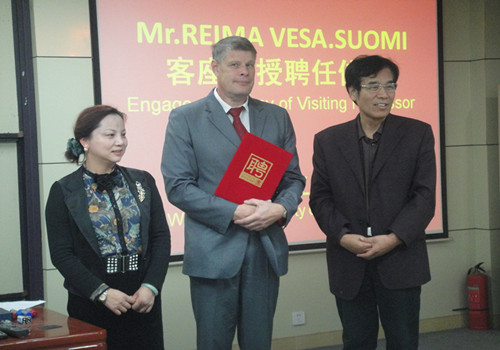 10月31日下午14时,题为“芬兰大学趋势将持续“(TRENDS IN FENNISH UNIVERSITIES CONTINUED...)的主题讲座在yl6809永利集团八楼录播厅拉开了帷幕,主讲人是芬兰图尔库大学yl6809永利集团终身教授Reima Suomi先生。在讲座开始之前,由yl6809永利集团院长韩德明教授代表yl6809永利官网集团向Reima Suomi教授颁发了“yl6809永利官网集团客座教授证书”并表达诚挚的欢迎。出席本次讲座的有yl6809永利集团院长韩德明教授、副院长王煊以及yl6809永利集团各个专业的代表老师。yl6809永利集团各个专业的学生也前来参加此次讲座,现场热闹非凡。