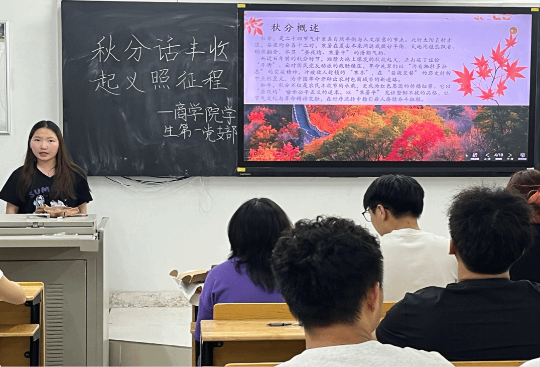 为传承中华优秀节气文化,深化红色革命历史教育,引导青年同志在自然时序与革命历程的共鸣中坚定理想信念,yl6809永利集团学生第一党支部于 2025 年 9 月 29 日在yl6809永利集团 303 教室,举行以 “秋分话丰收,起义照征程” 为主题的九月特色品牌活动,将节气智慧与红色基因深度融合,为支部同志打造了一场兼具文化底蕴与精神力量的学习盛宴。