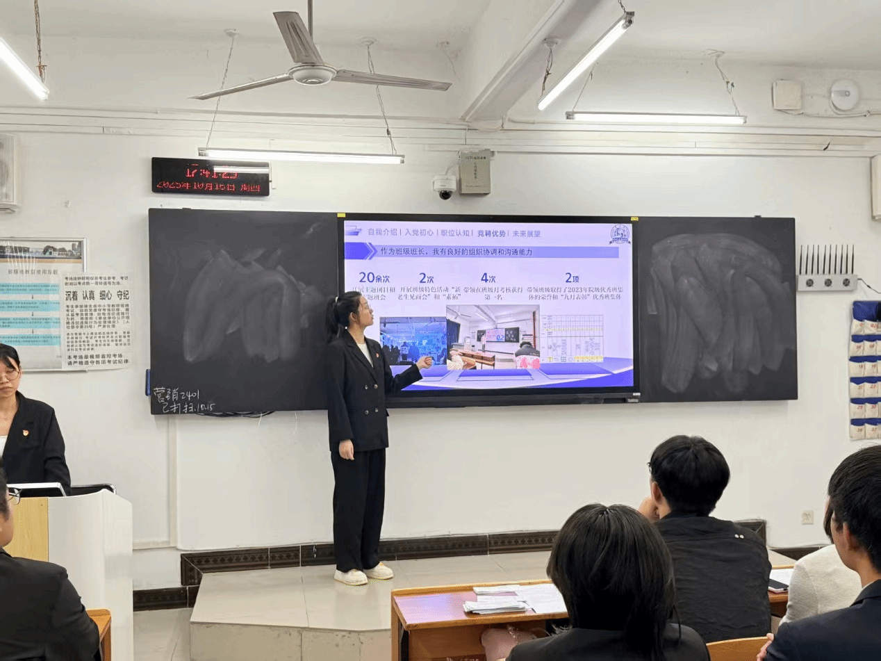 在随后的提问环节中,现任支委成员与支部书记熊文悦同志结合每位候选人的发言内容,就“如何增强支部凝聚力”“如何协调学习与党务工作之间的关系”“面对新时代青年党员特点,如何提升思想政治引领实效”等关键问题进行现场提问。各位候选人沉着冷静、思路清晰、应答有据,充分展现了扎实的政治素养、强烈的责任意识和良好的综合能力,赢得了现场阵阵掌声。