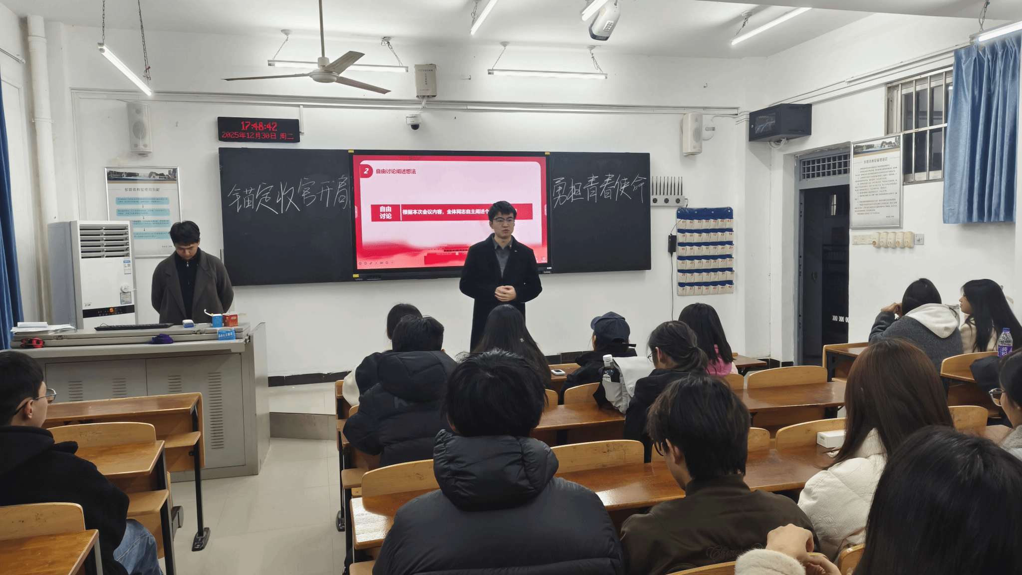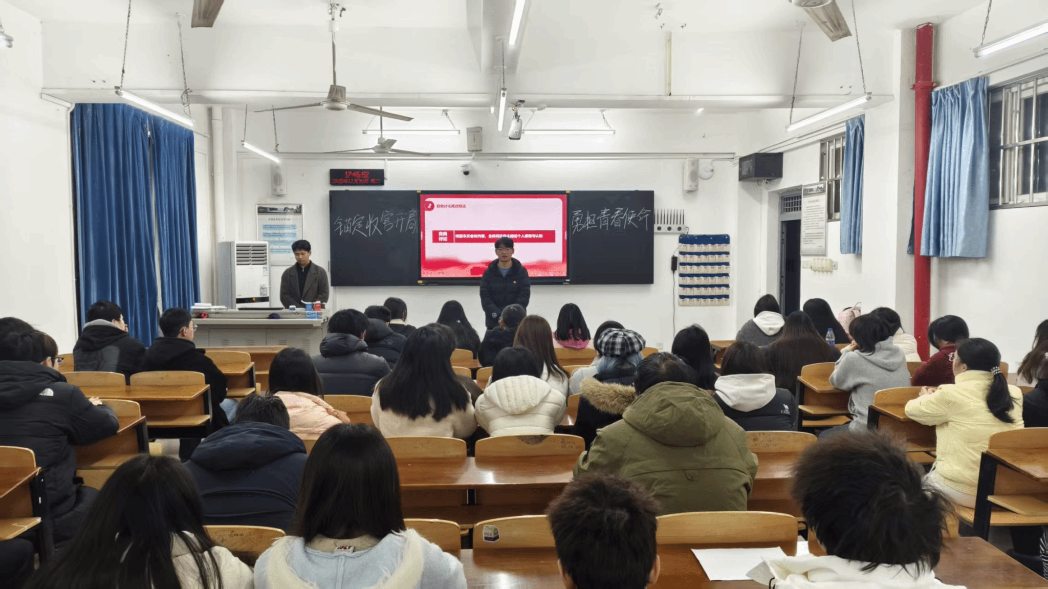 接下来,在交流讨论环节,支部同志们围绕锚定收官开局,勇担青春使命,聚焦学业成长与时代责任、个人理想与集体发展展开激烈发言。
