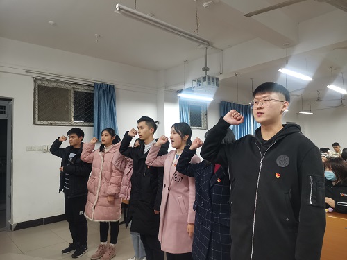 会议最后,第三党支部书记梅芳书记授予六名申请人党徽,并在统战委员张腾飞同志的带领下进行宣誓。会后,梅芳书记对本次发展大会进行总结发言,她说道:“成为预备党员是一种荣誉,更是一种责任,是通过自己的努力得来的,希望大家能够珍惜这个身份,承担起它的责任。在今后的道路上向支部优秀的同志学习,早日成为一名合格的中共党员。”