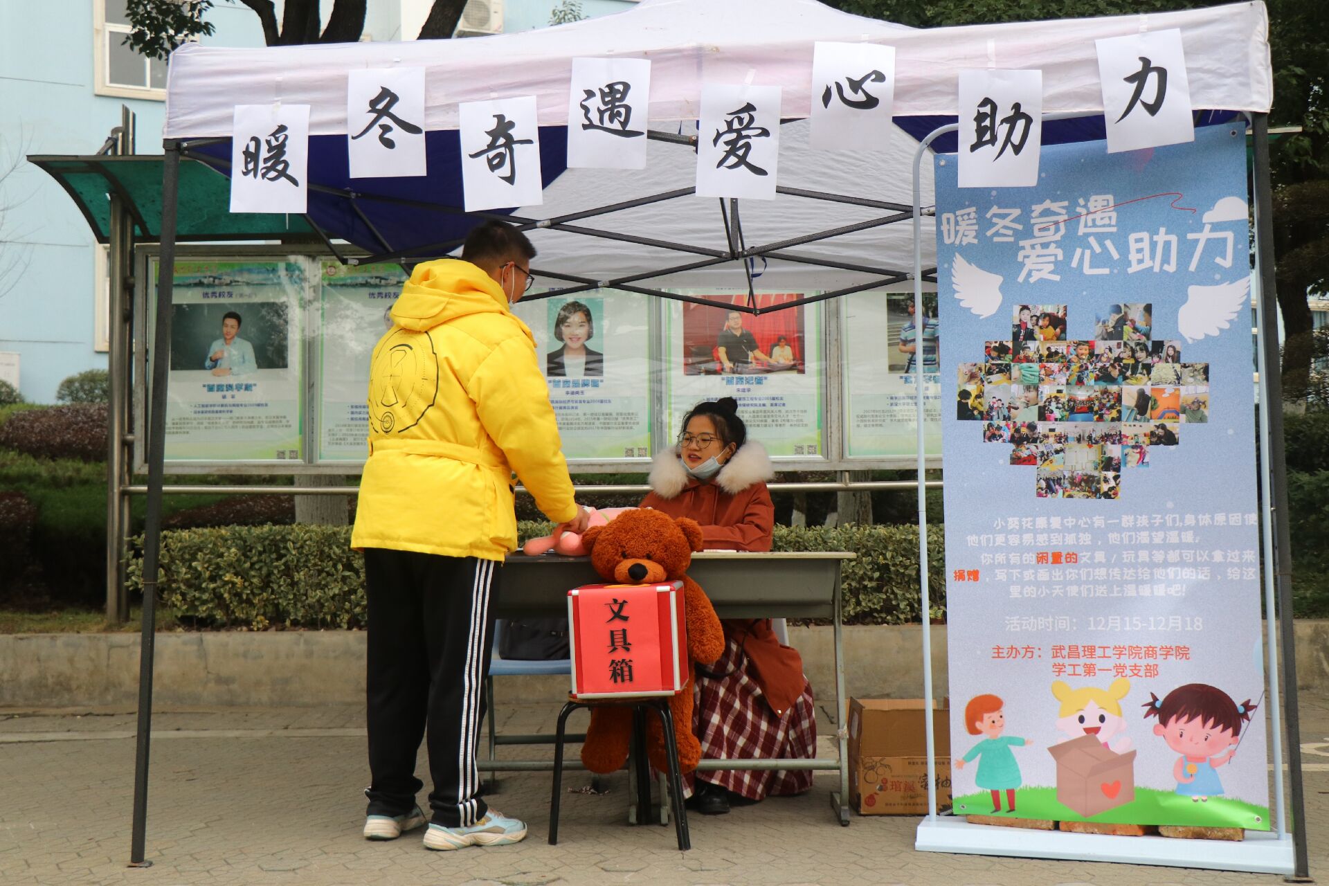 为给小葵花康复中心的小朋友们送去冬日温暖,发扬党员的服务精神,发挥党员先锋模范作用,12月15日,yl6809永利集团学工第一党支部在文化长廊和yl6809永利集团门口举办“暖冬奇遇,爱心助力”募捐活动拉开序幕。