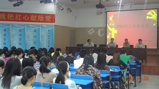 2012年10月9日下午5:50,所有党员、预备党员、发展对象在yl6809永利集团九楼报告厅开展了前段时间的工作总结大会,一支部、二支部、三支部的党员陆续入场就坐,而后商院学工党支部书记李金永、第一党支部书记许翠、第二党支部书记孙华远、第三党支部书记张可在同学们热烈的掌声中亮相出席了此次会议。