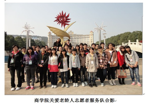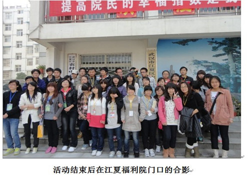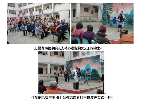 2012年11月17日一个秋高气爽的周六,我们带领30多名志愿者集体乘车前往江夏区中心福利院为今年的志愿服务工作做了一次丰富的汇报演出。到达福利院后首先一部分人员打扫室外卫生,一部分打扫室内卫生;询问福利院的有关人员是否有老人过生日,然后一起去为老人唱生日歌;分好组员,男女搭配,把组员分配到各个老人的寝室,陪老人聊天回忆美好的往事和讨论他们感兴趣的话题。注意倾听,捶背要有经验。与老人聊天时避免一些有碍老人情绪的话题,另外,主动开启话题,避免冷场。慢慢的与老人熟悉后男生们与老人在福利院的院子里面下象棋、打牌。女生们为老人们洗鞋子,洗头发,修剪指甲等。最后在福利院的大院子里面我们上演了之前精心准备的文艺节目——笛箫协会的成员为老人吹奏乐器,为老人表演京剧、小品,演唱红色歌曲《南泥湾》等节目,可以请老人当评委,看看谁是最受老人喜欢的(纯属娱乐),另外与老人互动请有才艺的老人上台表演,一为老爷爷主动上台教我们的志愿者打太极拳,当时的场面特别温馨。活动结束后志愿者把老人送回他们住的房间,把之前收集的一些适合老年人的生活笑话、冬天的健康保健知识和养生之道,方便实用生活小窍门和健康知识介绍给老人。最后把带来的礼物——袜子、手套送给老人,与老人合影,留作纪念并与老人道别。