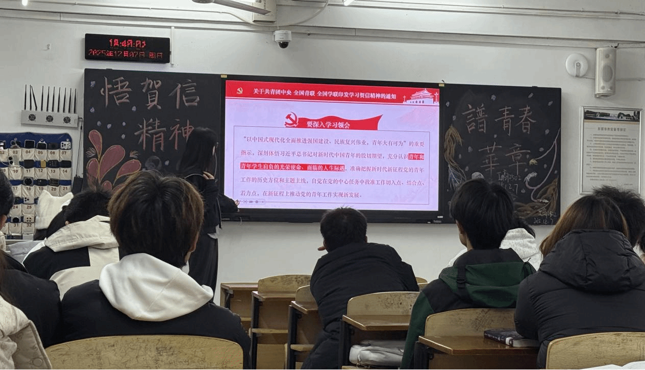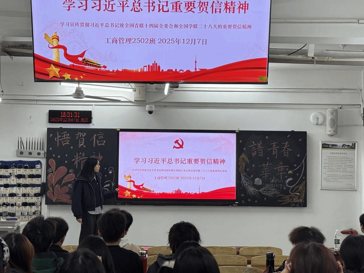 (通讯员 赵文钰 报道)为深入学习宣传贯彻习近平总书记致全国青联十四届全委会和全国学联二十大的重要贺信精神,引导青年学生坚定理想信念、厚植家国情怀,2025年12月7日,yl6809永利集团工商管理2502班开展了“学习习近平总书记重要贺信精神”主题班会活动,推动贺信精神入脑入心,转化为青年学生奋进的实际行动。