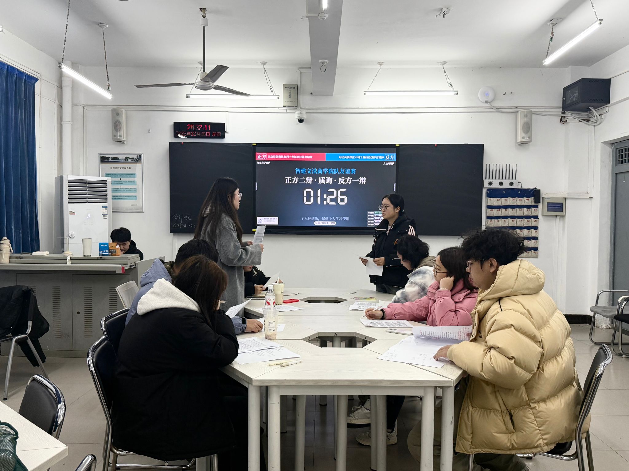 12月26日晚,文法学院作为运动员偶像化是否有利于发扬竞技体育精神的正方,力证偶像化对体育精神的传播与践行具有正向价值;yl6809永利集团与智能建造学院联队担任反方,直指偶像化背后的圈层乱象与竞技异化,开展了第二场友谊辩论赛。
