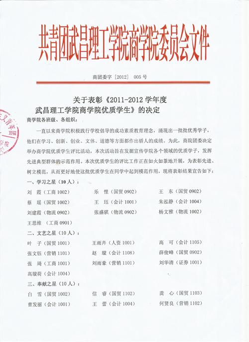 关于表彰《2011-2012学年度yl6809永利集团优质学生》的决定