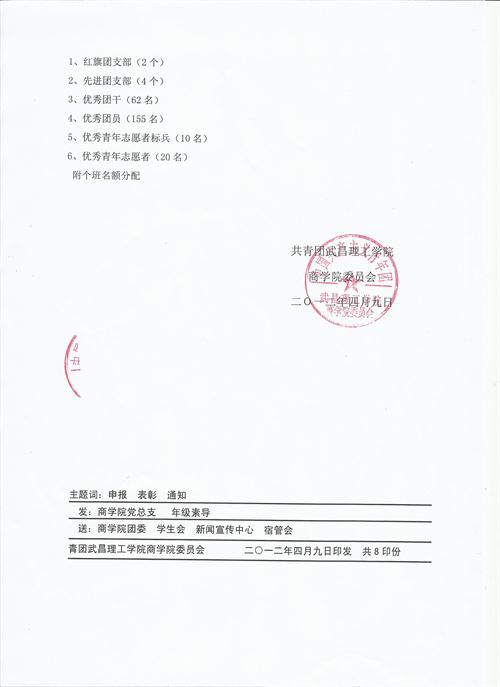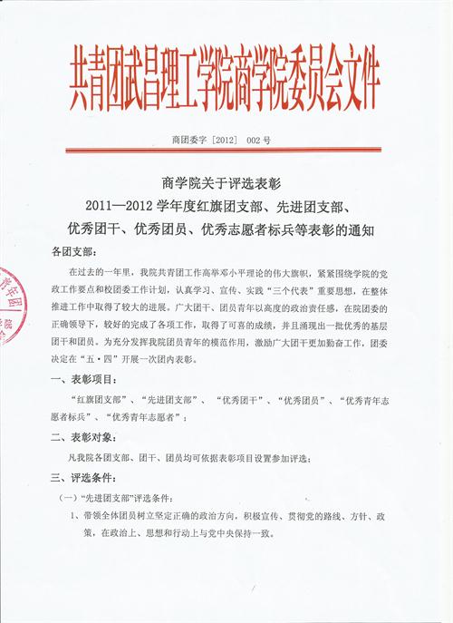 yl6809永利集团关于2011-2012学年度红旗团支部、先进团支部、优秀团干、优秀团员等表彰的通知