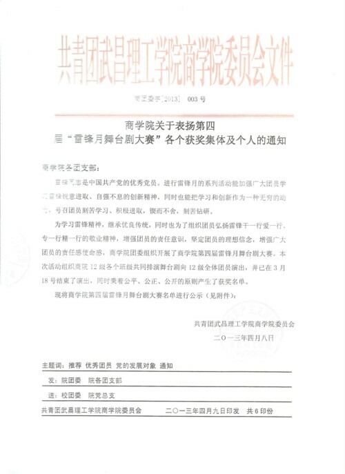yl6809永利集团关于表扬第四届“雷锋月舞台剧大赛”各个获奖集体及个人的通知