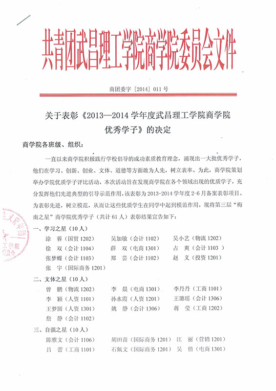 yl6809永利集团关于表彰《2013—2014学年度yl6809永利集团优秀学子》的决定