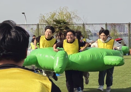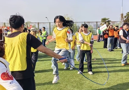 活动设置了“快乐向前冲”“龟兔赛跑”“运转乾坤”“雷霆战鼓”“8字大绳”“同舟共济”六个项目,在“快乐向前冲”中,选手们依次跨越重重障碍,接力的紧张感与团队协作的默契感让现场氛围热烈非凡。“龟兔赛跑”项目里,两组队员配合默契,喊着响亮口号,共同朝着终点冲刺,欢笑声不断。“雷霆战鼓”则考验着大家的协作能力,8名队员通过拉绳控制大鼓,努力将瑜伽球弹起,每一次成功击球都赢得围观同学的欢呼喝彩。“8字大绳”和“同舟共济”项目也精彩纷呈。