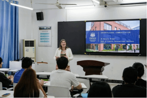 9月25日上午,在yl6809永利集团407教室,受邀来校访问的林肯大学国际yl6809永利集团院长Natalie Wilmot博士以跨文化交流为主题,为工商管理专业2302班的同学们带来了一场别开生面的讲座。她以“什么是文化”为讲座的切入点,从霍夫斯泰德文化维度理论谈到跨文化交流模型;从对高语境文化和低语境文化的比较谈到跨文化交流的障碍。满满一个半小时的讲座,使同学们对国际商务交流中的文化、社会等因素有了深入认识。讲座后,Wilmot博士也鼓励yl6809永利官网集团学生努力学好专业知识,并开阔国际视野,未来为中外文化交流作出贡献。