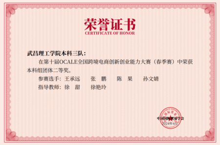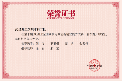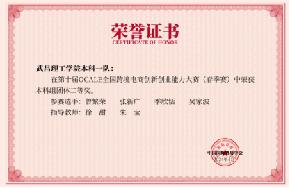 【通讯员 徐甜】由中国国际贸易学会主办的第十届OCALE全国跨境电商创新创业能力大赛于4月27日落下帷幕,来自全国462所院校2202位指导老师和9548位参赛学生加了此次比赛。我院国际经济与贸易专业三支参赛团队在徐甜、朱莹、徐艳玲等教师的指导下取得了优异成绩,荣获团体二等奖三项。