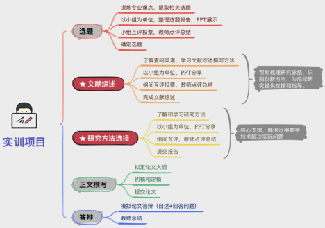 课程打破传统“教师主导”模式,构建“五阶互动式”教学体系,学生在选题策划、文献综述、方法创新、论文撰写、答辩实战全流程中成为创新实践的主体。通过小组任务、互动讨论、成果展示等多样化教学形式,学生从“被动写作”转向“主动创造”。