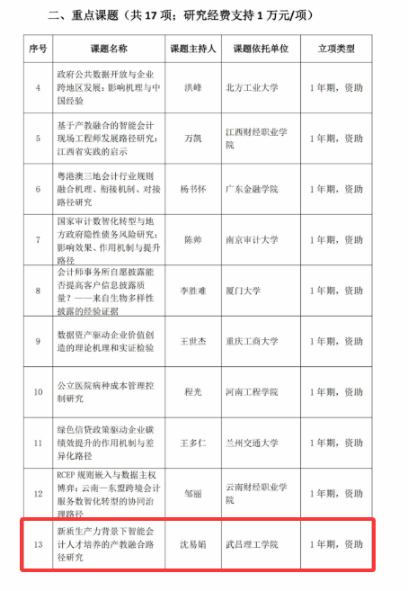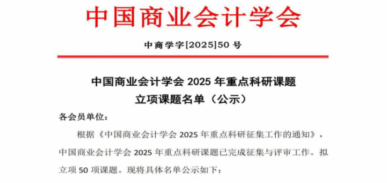 (通讯员 鲍炤 祝娅婷)近日,中国商业会计学会2025年重点科研课题立项课题名单公示,yl6809永利集团沈易娟教授主持申报的课题《新质生产力背景下智能会计人才培养的产教融合路径研究》,再次获得重点科研课题立项,并获得立项经费1万元。