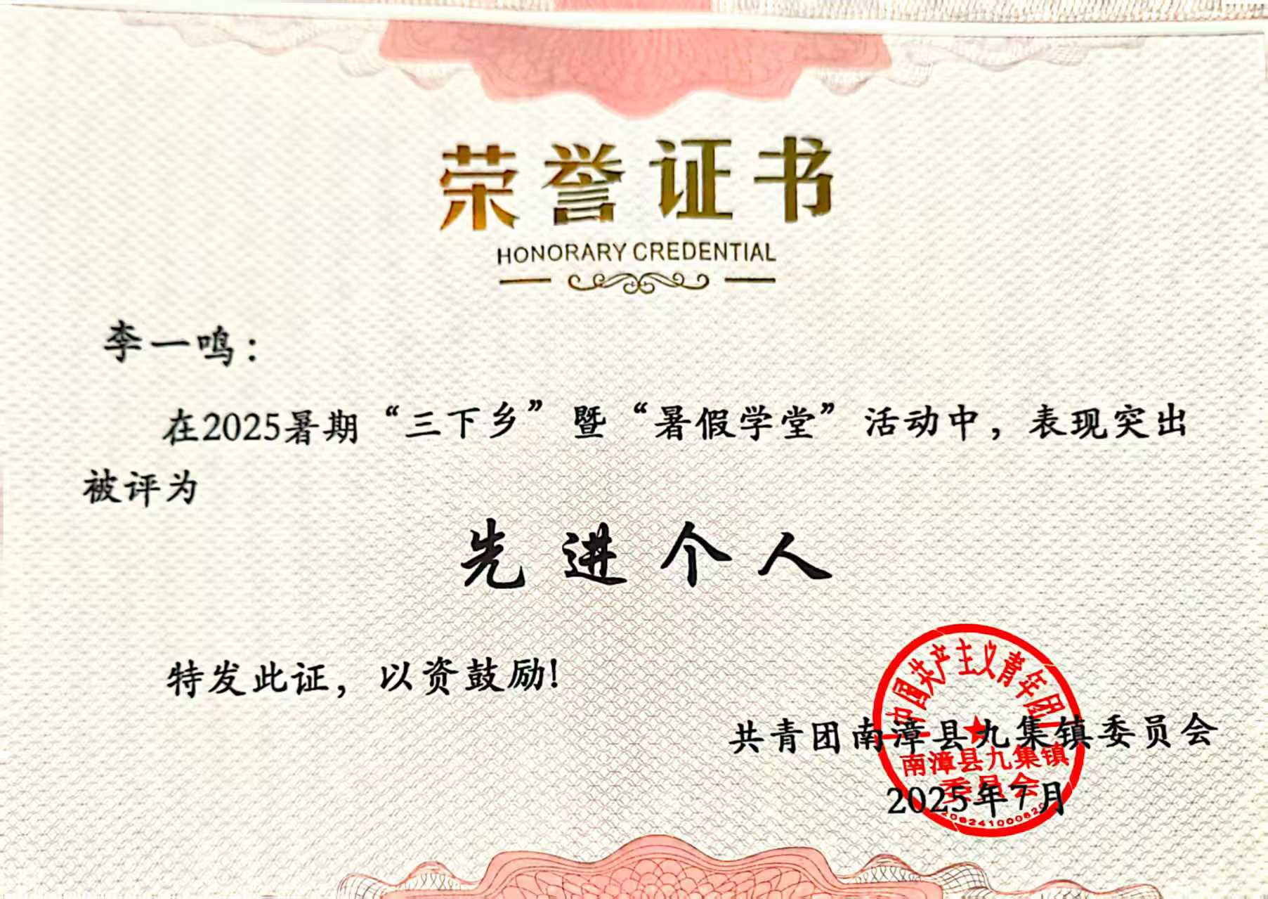 走出校园,他将目光投向更广阔的天地。志愿服务时长累计200余小时,这串数字背后,是李一鸣一次次躬身实践的热忱与坚持。2025年暑假,他奔赴湖北襄阳参与“三下乡”支教,在乡村讲台上为孩子们点亮梦想之光,也因此获评“先进个人”“优秀青年志愿者”及校级先进个人;作为“两弹一星”精神宣讲团主要负责人,他用青年之声传承家国记忆;日常的汤逊湖清洁、梧桐社区服务、新生迎新等志愿一线,也处处可见他忙碌的身影。躬身力行,他将奉献写进了大学生活的每一个角落。