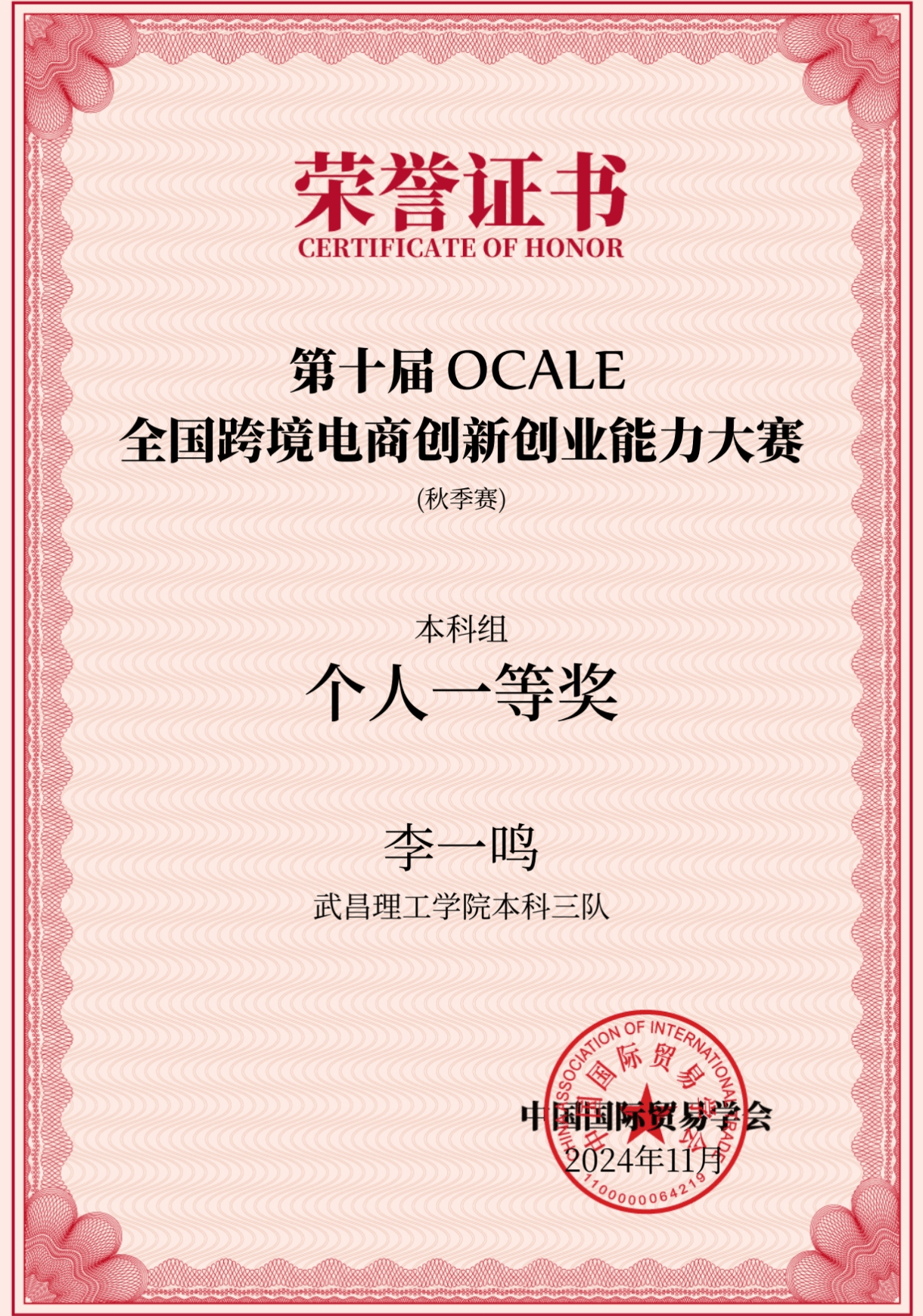 竞赛场上,他用实力说话。在老师的悉心指导和队友的默契配合下,李一鸣一路披荆斩棘:从“词达人”校级三等奖,到湖北省“天翼云杯”营销策划大赛校级二等奖;从国际大学生创新创业大赛校赛铜奖,到第十五届三创赛校赛二等奖;他更在全国舞台上崭露头角,斩获第十届OCALE全国跨境电商创新创业能力大赛全国一等奖、ETF基金赛全国优秀奖等系列荣誉。一张张证书,是他与团队日夜打磨的成果,也是专业知识转化为实践能力的生动见证。