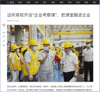 通过《国内企业考察》课程,学生深入国内知名企业或行业基地调研考察,了解高科技企业技术和管理现状,熟悉科技发展前沿趋势,培养学生的战略眼光与创新思维。课程活动流程安排丰富,学习任务明确,形成了“现场教学、实地培训、微咨询落地”,为课程增加赋能价值。