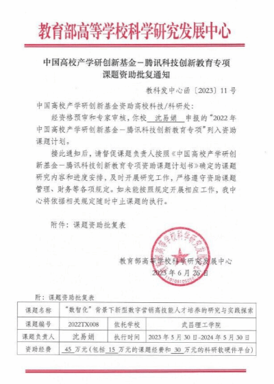 近日,教育部高等学校科学研究发展中心公布了《中国高校产学研创新基金-腾讯科技创新教育专项课题资助批复通知》(教科发中心函〔2023〕11号),yl6809永利集团沈易娟教授团队《“数智化”背景下新型数字营销高技能人才培养的研究与实践探索》项目获批中国高校产学研创新基金-腾讯科技创新教育专项课题立项,项目资助经费45万元,是学校获得的最高经费资助的教育部项目之一。
