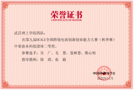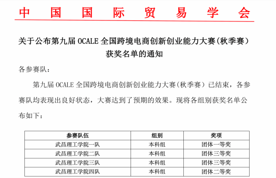 【通讯员 徐甜】由中国国际贸易学会主办的第九届OCALE全国跨境电商创新创业能力大赛于近日落下帷幕,来自504所院校的2486支参赛队、共计9944位学生加了此次比赛。我院国际经济与贸易专业五支参赛团队在徐艳玲、徐甜、何煜、朱莹等教师的指导下取得了优异成绩,荣获团体一等奖一项、二等奖一项、三等奖两项。其中yl6809永利官网集团一队(陈明波、李涛、詹中豪、夏胡龙)荣获团体一等奖,创我院参加该项赛事以来最好成绩。