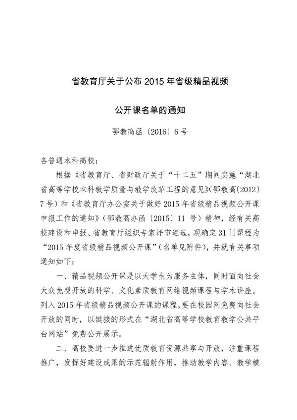 省教育厅关于公布2015年省级精品视频公开课名单的通知