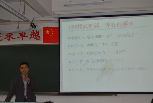 10月16日晚19时,2014-2015年新学期梅南经管论坛专业讲座在商院512拉开了帷幕。这是本学期以来梅南经管论坛第一次专业讲座,邀请了中南财经政法大学的赵琛徽教授作了有关《企业人资源管理变革与创新》的主题讲座。赵教授是湖北省人力资源学会副秘书长,国际人力资源研究所所长以及南湖人才开发公司董事长。人力资源管理专业的13级、14级同学积极踊跃的参加了本次讲座。