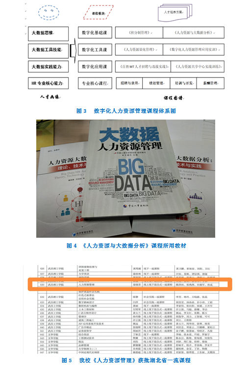 (2)《人力资源与大数据分析》。课程培养大数据思维模式,帮助学生建立人力资源与大数据分析之间的逻辑联系,具备大数据收集与预处理、存储与管理、分析与挖掘等基本技能。通过该课程的学习,学生应该掌握大数据技术与人力资源管理相结合的基本概念、基本理论和实际应用,并能够运用相关的大数据技术和人力资源管理理论知识,系统化的解决现实中的人力资源管理问题。运用大数据的技术促进企业人力资源管理的转型升级,提高学生对于大数据技术的应用能力、社会现象的分析判断能力、前沿理论知识的学习理解能力、逻辑推理能力。