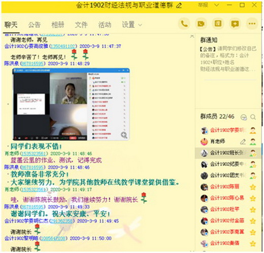 个人觉得值得一提的是:我在组织学生准备进入课堂时并不占用课堂的时间,而是7:40进行在线举行升旗仪式。课堂上,围绕知识点“会计工作的行政管理”准备了很多生活化、现实的讨论话题,激发了同学们很大的兴趣,教学内容中还添加了防疫、爱国、时事等与时俱进的内容,倡导尊重自然,敬畏生命,直播过程中很多同学在讨论区与老师进行积极的交流分享,在线课堂气氛活跃,受到同学们一致好评。授课结束时“老师辛苦了”的学生评价在群里不断闪烁,大家感觉意犹未尽,感觉怎么这么快就下课啦?这些来自于学生的认同激励我日后更加努力的提升自己,更好的教导学生。