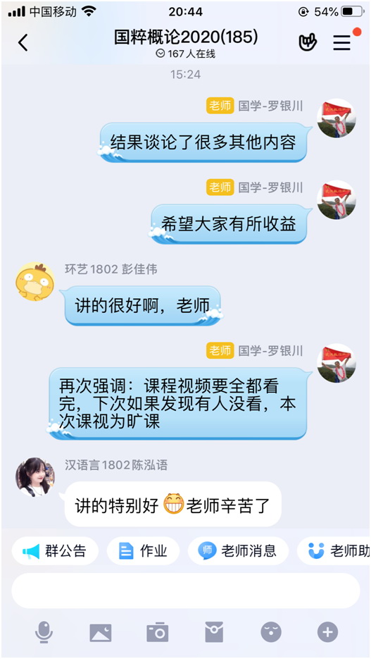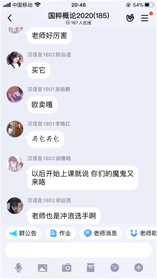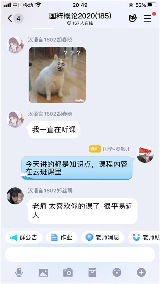 1. 按照教务处要求,有关课程的几乎所有资料都是提前或课后全部放上云班课平台,本人基本是提前推送,偶尔会抓住一些没有做好预习的同学进行预习提问,起到一定的督促作用。不过,考虑到《国》课是大班上课,有的行政班达一百多人,全员直播监控较为不易(加之有不少学生在调查问卷里反映家里网络不畅),基本就采用录屏视频的方式,提前一两天将所讲授内容发送到云班课平台,在课程时间段里主要进行各种互动,如选人、抢答、头脑风暴、讨论,而且尽可能采用大家喜闻乐见又与课程内容密切相关的话题来进行互动,互动一结束,马上进行解读。这时候,QQ群里的讨论与答疑就成为主导,有时候差不多两节课都在这样进行讨论。虽然可能会耽误学生观看录屏视频,但课后要求大家利用课余时间看完本次课的所有视频,后续来看,学生们基本也能做到。
