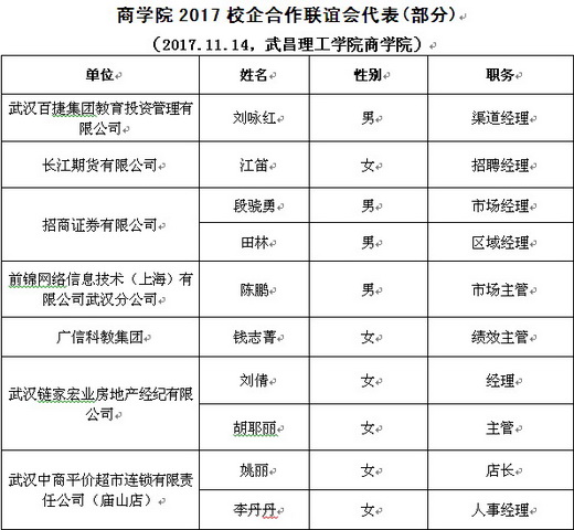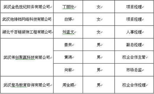 yl6809永利集团2017年校企合作联谊会11月14日下午在学院七楼大会议室隆重举行。来自广信科教集团、武汉百捷集团教育投资管理有限公司、长江期货有限公司、招商证券有限公司、前锦网络信息技术(上海)有限公司武汉分公司、武汉伟创聚赢科技有限公司和武汉中商平价超市连锁有限责任公司等12家公司的高层管理人员出席会议。参会企业覆盖到实业集团、互联网技术、房地产、人力资源服务、商业零售、金融投资、证券等行业。 高琼常务副书记主持会议。yl6809永利集团徐宏毅院长致欢迎辞,教务处李耀宗副处长代表学校在会上讲话。yl6809永利集团陈洪权教学副院长主持校企合作座谈。 会议代表就校企合作方式、本科专业人才培养方案的完善深入交流。企业代表在简要介绍企业情况后,围绕我校本科专业人才培养课程体系设计、企业用人要求以及企业期望发了言。各专业系主任畅谈了座谈体会,就实践教学、师资队伍、课程建设、人才质量标准等与企业代表深入沟通,表示要加强与企业联系,有序落实座谈会成果。 会议气氛热烈,大家畅所欲言,取得如下成果。 一、校企双方达成共识 企业对我校服务地方经济的应用型人才培养定位深表赞赏,表示要紧密合作。此次参会企业中大部分是合作多年的老朋友,如招商证券有限公司、前锦网络信息技术(上海)有限公司武汉分公司、武汉链家宏业房地产经纪有限公司等,他们对我校成功素质教育办学理念和人才培养模式,以及学生质量给予高度的认可。上岗学生中已在这些单位担任了主管、经理、区域经理等重要职位,为公司创造了丰富价值,得到用人单位的肯定。据悉,武汉链家是一家集房屋经纪、房产金融、互联网一体的公司,接收了超过30名yl6809永利官网集团学生在就业。 二、校企深度交流合作 1.订单培养。武汉链家、武汉千百炼、武汉他排档、武汉伟创聚赢、武汉百度百捷等企业表达订单培养强烈愿望。广信科教集团今年九月已开启了广信工商班、广信营销班定制培养课程。 2.项目嵌入。武汉伟创聚赢科技有限公司、武汉楚马教育咨询有限公司、武汉中商平价超市连锁有限责任公司对电子商务、物流管理、市场营销等专业人才需求旺盛。期望通过教育部产学协同育人计划、微营销创业平台、跨境电子商务精品课程实验室等方式开展深度合作。共同完成课程建设、师资培训、就业外包服务、人才培养方案完善、技能竞赛、实习实训基地建设等领域的合作。 3.客座教授。双方保持长期合作,提升合作层次。校方聘请公司高层管理者任客座教授担任相关实践课程教学或行业动态讲座,企业邀请高校教师挂职锻炼或承担培训任务。 4.实习指导与管理。企业积极接收我校学生,并协助学校对集中实习学生管理与指导、评价与考核。 双方认为,提升互信,持久合作,创建民办高校校企合作示范工程。希望加强沟通交流,商学融合,共同培养社会所需要人才。 三、实现专业与企业面对面 结合双方意愿,各专业系将采用多种方式(或渠道)组织学生与企业见面。企业提供用人信息及其要求标准,各专业推荐优秀学生实习。达成主要合作成果。 1.会计专业与武汉金色世纪财务公司合作,开展顶岗实习,真帐真做。在往年合作基础上,增加制造行业会计帐务处理内容,丰富实习内涵,增强专业技能针对性。 2.国际经济与贸易专业与武汉他排档网络科技有限公司合作,开展“1+3”模式的专业实习。由他排档公司提供跨境电商实习平台,第一周进行校内培训,筛选入职学生进行为期三个月的集中实习。 同时,与武汉楚马教育咨询有限公司开展跨境电商校企合作,就电子商务师考证,人才培养(课程嵌入),实习实训合作,精品实验室建设订单培养(120人/年,电子商务运营、物流管理技术方向人才培养),等达成意向。 3.工商管理 、物流管理、电子商务专业与武汉中商平价超市连锁有限责任公司合作,实行人员与项目对接。提供专业岗位和自主创业机会。涉及实习岗位包括:财务管理、电子商务、营销、物流配送、人力资源管理等专业。提供基本薪酬和完备的“五险一金”待遇。 4.市场营销专业与武汉百度百捷集团、武汉链家宏业房地产经纪有限公司合作,开展实习。实行商学融合,定单式培养等深度合作。需求岗位包括:电子商务、营销、投资、财务人员、合伙人、经纪人和HRBP等。 5.投资学专业与招商证券、长江期货有限公司继续合作,开展执业资格证培训,提供实习岗位(前后台人员)。长江期货公司期望学生能选修有关产业行业知识课程,以尽快适应业务操作。 6.人力资源管理专业与前锦网络信息技术(上海)有限公司武汉分公司——前程无忧公司合作。开展人力资源管理实践类课程对接,提供人力资源服务业相关实习岗位。 四、合作企业的相关建议 1.加强应用型人才培养 培养“会实务、懂操作、精外语”的国际化人才;培养与具有行业知识结构的工商管理、人力资源、证券期货从业人员;培养能静心于企业一线的物流、营销、投资类人才;培养定位于中小企业,突出动手能力的会计专业技能人才。 电子商务人才培养可以从四个方向定位:(1)技术方向,如平台建设、产品设计、数据挖掘等;(2)营运人才方向,包括营销岗位,如在线客服岗位和电话营销岗位等,包括中小企业电子商务代运营管理;(3)物流方向,电子商务物