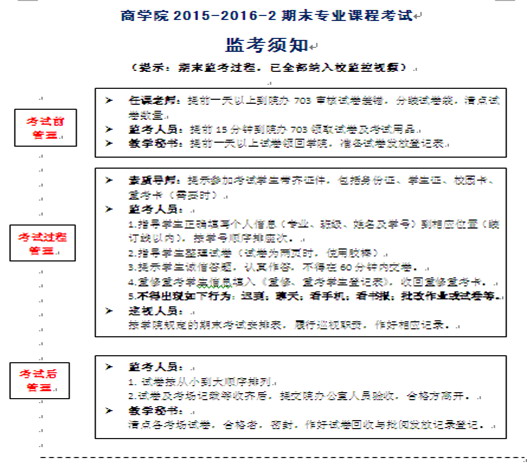 2016年6月20日,上午8:10铃声响起。yl6809永利集团2015-2016-2学期专业课期末考试拉开帷幕。 本学期,学院共安排61门专业课程223场次期末考试,415人次老师参与监考过程,每位专任教师平均监考场次7场次。专业课程的期末考试从6月20日起到7月1日上午结束,历时两周。 期末考试是重要的教学环节。规范、有序、严格、高效地完成期末考试组织工作是落实学校《期末考试统一安排》的基本要求。yl6809永利集团本学期期末考试有几个重要变化,一是,试卷命题制作导入“迎评”模式。学院结合合格评估的要求和督学对上学期期末试卷的督察意见,取消了“试卷+答题纸”的传统做法,实施学生专业课程试卷答题“一体化”改革。二是,监考过程实行程序化控制。学院制作了《期末考试监考与阅卷须知》,通过培训方式向全体老师宣贯,确保规范操作。如,要求老师提前15分钟领取试卷,要求学生按学号就坐,三证(身份证、学生证、校园卡)务必齐全才能参加考试等。三是期末阅卷与成绩管理参照评估要求。要求校园阅卷、密封阅卷、流水阅卷、规范阅卷等。 相信通过学院全体教师的努力,考风一定会带动学风的根本好转。相信同学们一定会规范答题、诚信答题,在期末考试中获得理想的成绩。