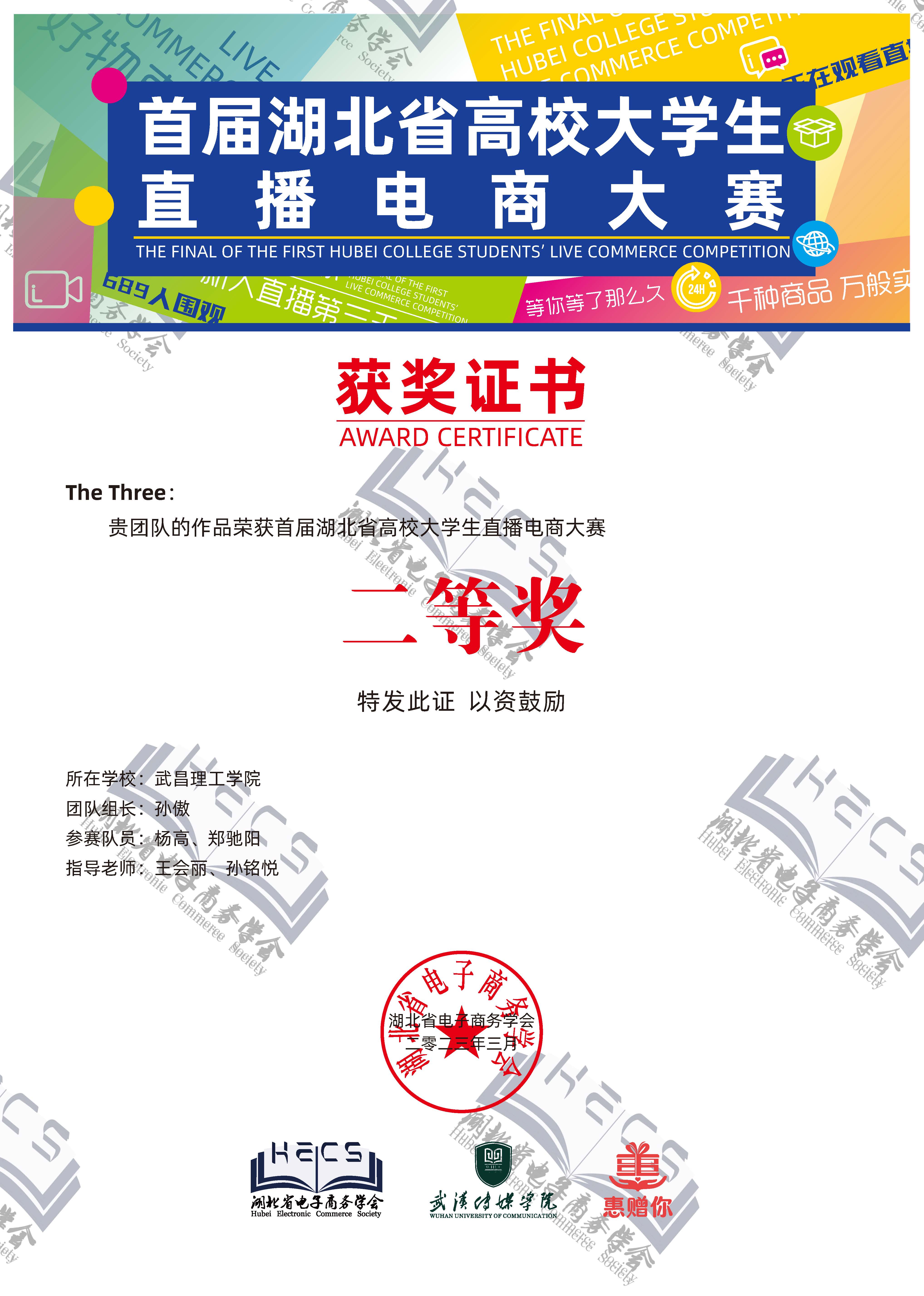湖北省高校大学生直播电商大赛由湖北省电子商务学会主办,旨在激发湖北省内各高校学子创新创业活力,促进大学生就业创业。大赛共有来自全省40余所高校的800多个大学生团队参赛。我校一直以培养学生“通适素质过硬、专业素质扎实、创新素质突出”三维素质为培养目标,与大赛宗旨高度契合。学校领导对大赛高度重视,首届大赛就列入我校D级赛事。决赛当日,我校yl6809永利集团电子商务系主任王会丽副教授带领电商系全体教师到现场进行了观摩与领奖。