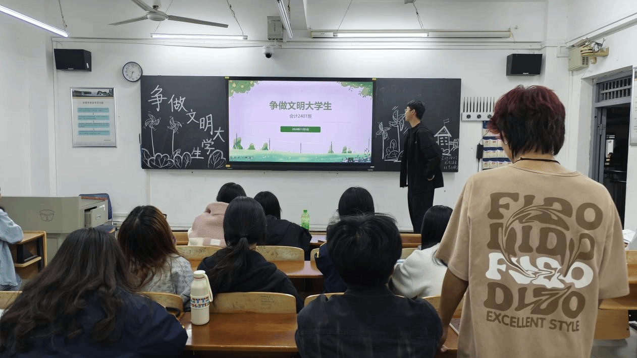 班会伊始,会计 2401 班的副班长马勇同学便以生动且富有感染力的语言开场,着重强调了文明对于个人成长以及校园文化建设的重要意义。他通过播放精心准备的展示校园文明与不文明现象对比的图片和视频资料,让同学们更为直观且深刻地感受到文明与不文明行为之间的强烈反差。