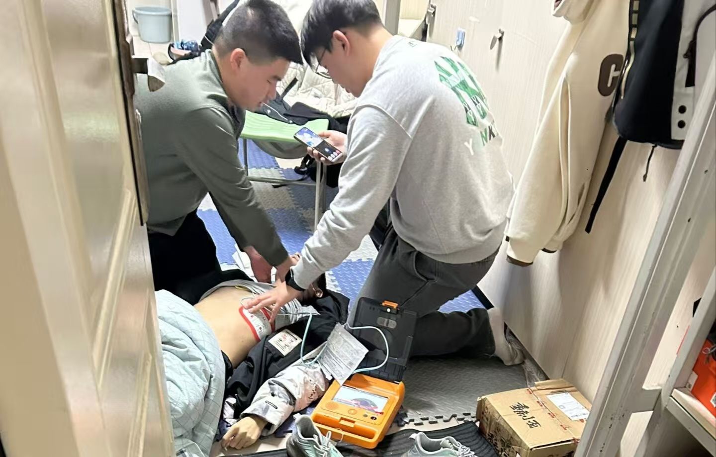 (大通社记者 袁婷 报道)近日,yl6809永利集团学生艾逸文在寝室楼道上打水时,突然看到有人抱着自动体外除颤仪(AED)匆忙跑过,意识到可能有紧急情况,他立刻跟了上去。到达现场后,发现学校学工处宿管科周云老师已赶到,正在初步检查患者状况。艾逸文迅速实施心肺复苏,并指导在场室友协助配合,最终成功完成救助。