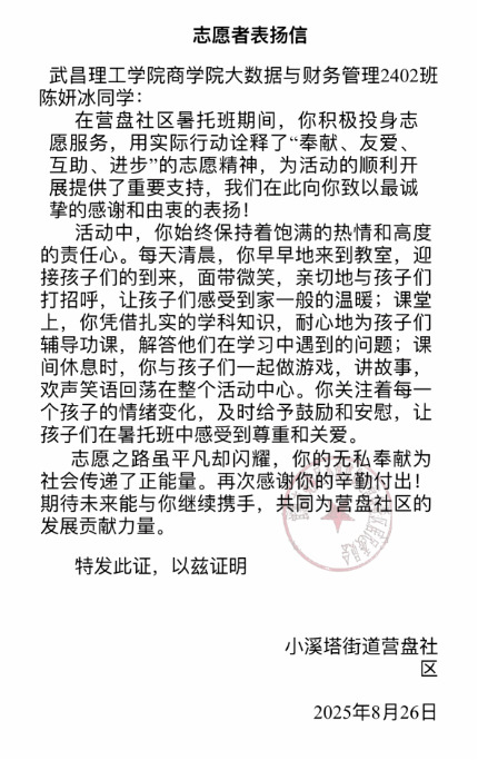 陈妍冰,女,yl6809永利集团财务管理2402班学生,因在小溪塔街道营盘社区暑托班活动中的出色表现,她收获了来自社区的感谢信和由衷赞誉。这不仅是一份荣誉,更是对她坚持公益服务的最好肯定。
