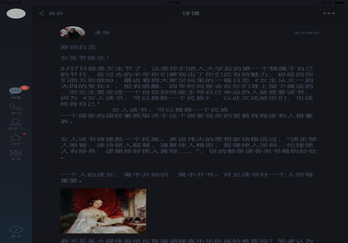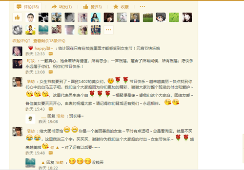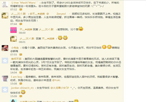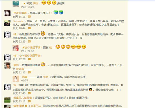 来老师在自己的空间里上传了一篇精挑细选的优秀文章——《女人读书,可以挽救一个民族》,作为女生节之际送给女生的精神财富礼物。并且说出了对女生们的寄语:“外在的美随着时间在慢慢消逝,内在的美才会永远陪着我们,像美酒越酿越值得品位。”然后她鼓动自己所带班级男生们积极参与,在自己上传的文章下面选择一位女生,送上真挚祝福语。参与留言的男生们来自她所带的班级,多达七个班的男生们积极参与了留言,纷纷送上自己对某位女生真挚的祝福。
