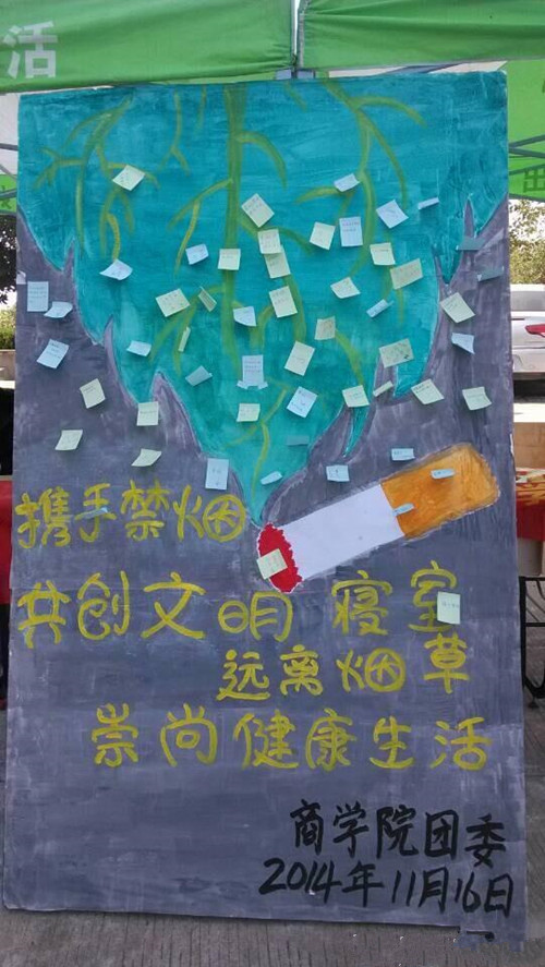 据记者了解,此活动由yl6809永利集团宿管会举办,时间为一周。为防范同学们出现吸烟等不好的习惯,也考虑到吸烟有害健康,商院宿管会特举办了这次活动。宿管会不仅在这里进行横幅上签名、宣传板上写寄语的收集活动,还在西七楼道贴上了富有创意的宣传画。这些宣传画是宿管会宣传部同学网上找图后,后期进行加工处理完成的,宣传标语也是自己添加上去的。