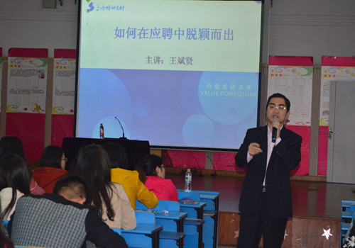 此次讲座中,王斌贤老师分别从“定位是关键”、“简历是敲门砖”及“面试是技术活”这三个方面进行他的整个演讲。首先,在“定位是关键”方面,王斌贤老师从当前就业严峻、企业招人困难的角度出发分析当代大学生观念中的求职误区。让学生明白自己走出校门时,自己学生的角色、在学校所学的理论以及自己身处学校环境的转变。王斌贤老师还告诉学生,在求职时,应该了解企业用人的理念,调查企业的企业文化和招聘特点。在“知己知彼”的环境下,为自己做出合理的职业规划以及面试准备。
