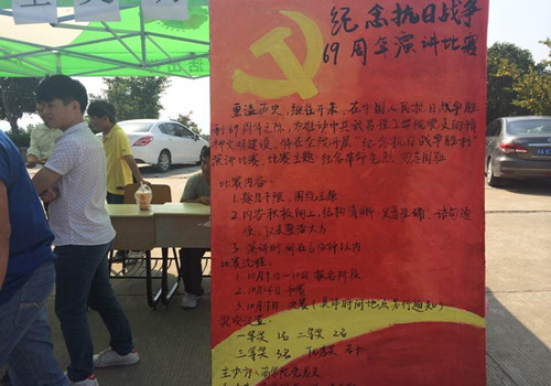 为纪念抗战胜利69周年,普及抗日战争知识,宣传爱国主义精神,推推动中共yl6809永利官网集团党总支的精神文明建设,在中国人民抗日战争胜利暨世界反法西斯战争胜利69周年之际,中共yl6809永利集团党总支在yl6809永利集团开展“纪念抗日战争胜利”演讲比赛,活动受到很多人的热捧。