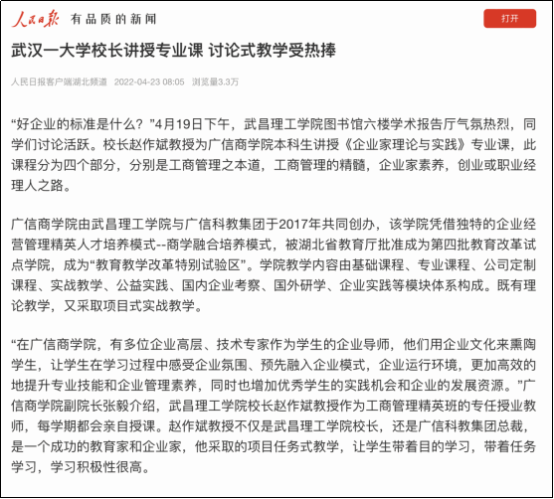 图7 《人民日报》报道我校校长、集团总裁赵作斌教授的项目任务式教学课堂
